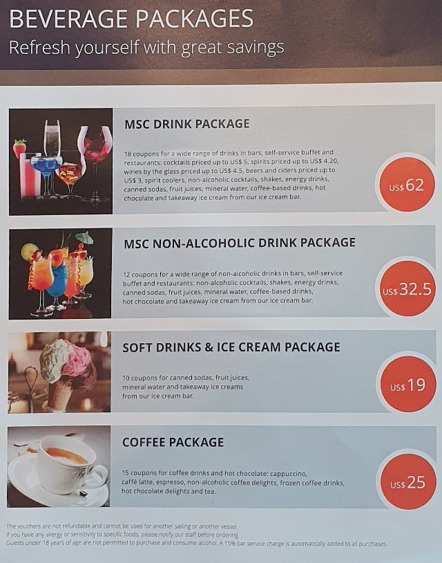 Hieronder is wat drunk drink pakkette op die MSC Orchestra in Januarie 2020 gekos het: $25 for 15 koepons koffie, of $19 vir 10 roomys & soft drinks.