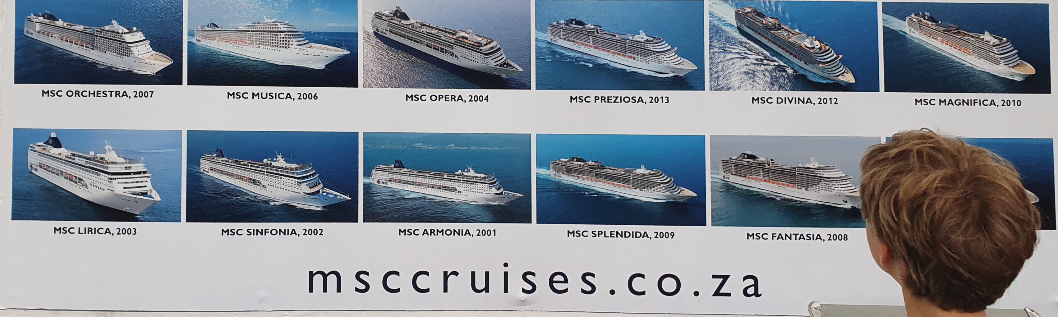 Here is 'n foto by Durban se hawe, van die meeste van MSC se skepe, en die jaar wanneer MSC hul gebou of gekoop het: MSC Orchestra (2007), MSC Musica (2006), MSC Opera (2004), MSC Preziosa (2013), MSC Divina (2012), MSC Magnifica (2010), MSC Lirica (2003), MSC Sinfonia (2002), MSC Armonia (2001), MSC Splendida (2009) en MSC Fantasia (2008).